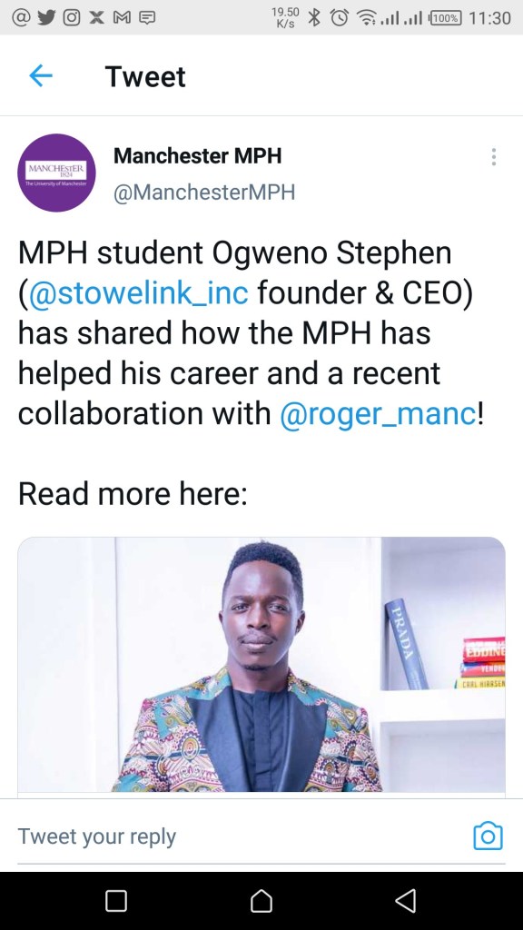 Ogweno Stephen was recently featured in the University of Manchester Biology, Medicine And Health Student Blog where he was discussing how his current studies in Global Health have helped him amplify the work in the non-communicable diseases space.
