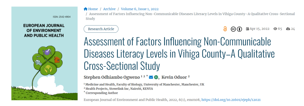 We wanted to share with you one of our scientific research publications that was just recently published on our work in VIHIGA COUNTY. The research was looking at Assessment of Factors Influencing Non-Communicable Diseases Literacy Levels in Vihiga County–A Qualitative Cross-Sectional Study.