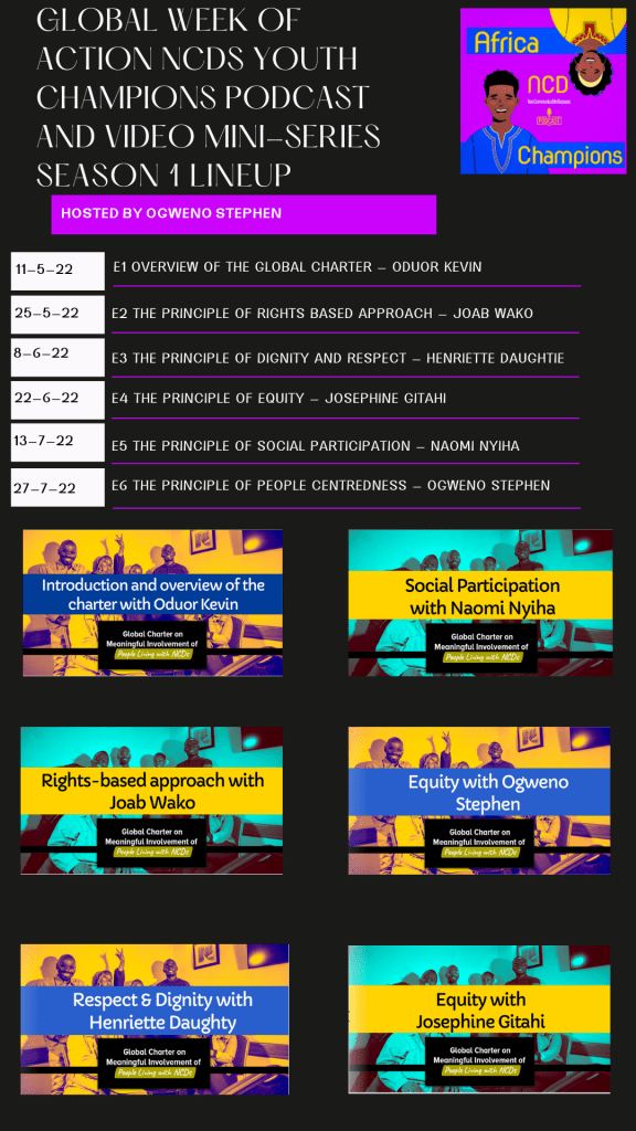 Stowelink recently partnered with the NCD Alliance Of Kenya and the NCDs patient group caucus to develop and distribute a dissemination of the Global Charter for Meaningful Involvement for People Living with NCDs. This was done through a mini audio-visual podcast series that was hosted by Ogweno Stephen and can now be accessed and watched across the world through listening in on podcast and YouTube platforms. This was an excellent way to disseminate and endorse the charter by involving young people to run the campaign as a result leverage on their platforms and reach them there with this information and opportunity.