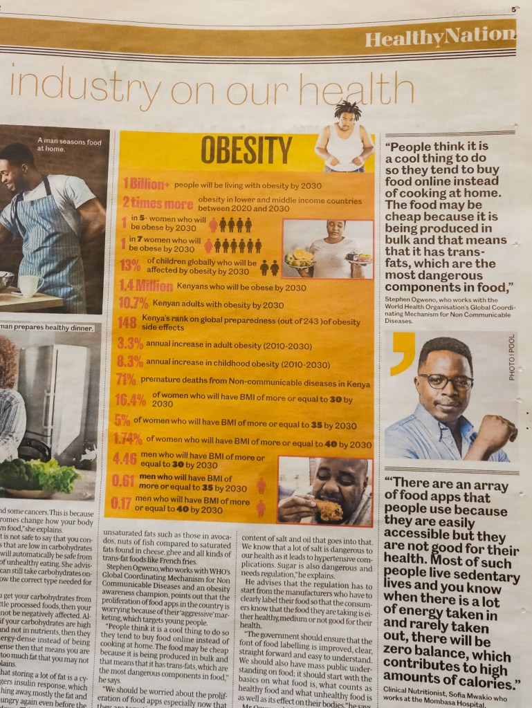 Ogweno Stephen recently featured and contributed to a viral two-pager article on The Daily Nation Newspaper addressing the conversation on obesity in Kenya and the role that food applications and targeted advertising play. In the news article Ogweno addresses the critical question on the effect of these food apps but more than that he also offers practical suggestions and recommendations to solutions both at a policy level and implementation level to ensure better quality of food and a reduction in obesity attributed to food apps.