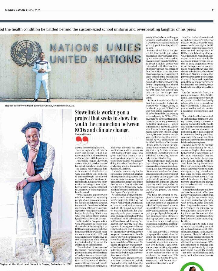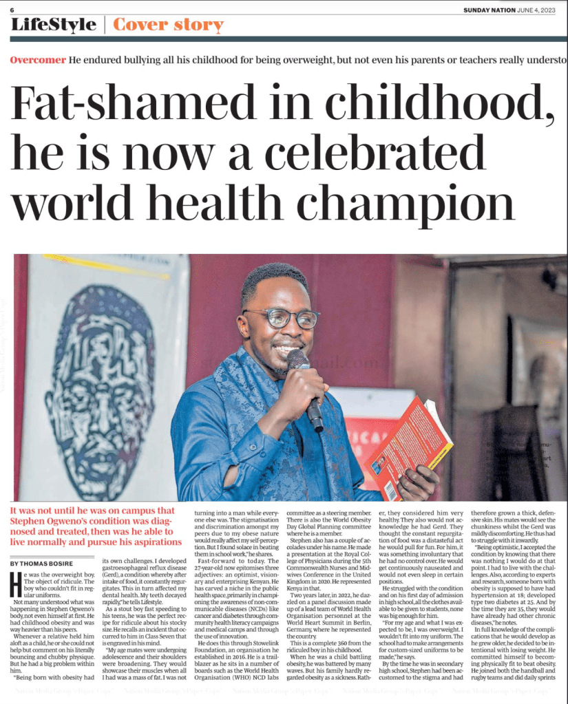 Ogweno Stephen recently gained significant recognition as he was featured in a spotlight article by the Daily Nation newspaper. The feature comprehensively documents Ogweno’s journey, from his experiences with childhood obesity to his establishment of the Stowelink foundation and his role as a global health advocate in collaboration with the World Health Organization (WHO).